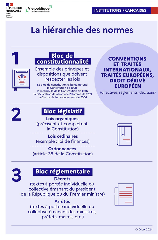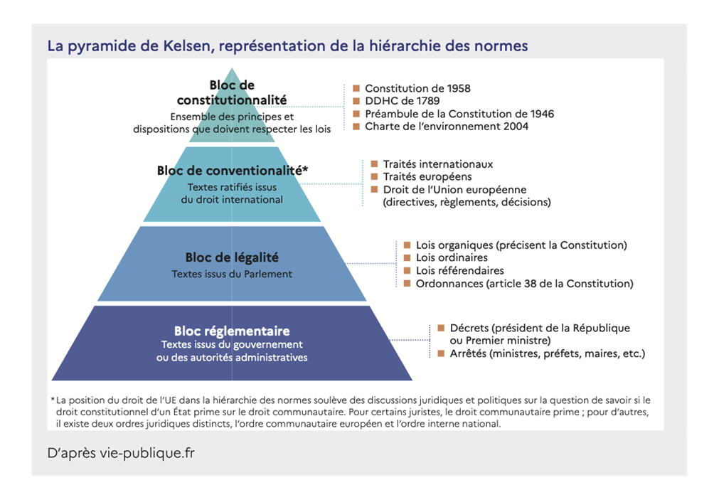 Voici la hiérarchie des normes en France et la pyramide de Kelsen qui y correspond